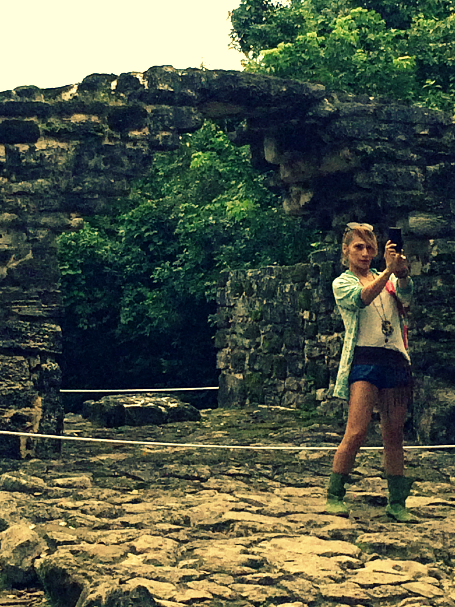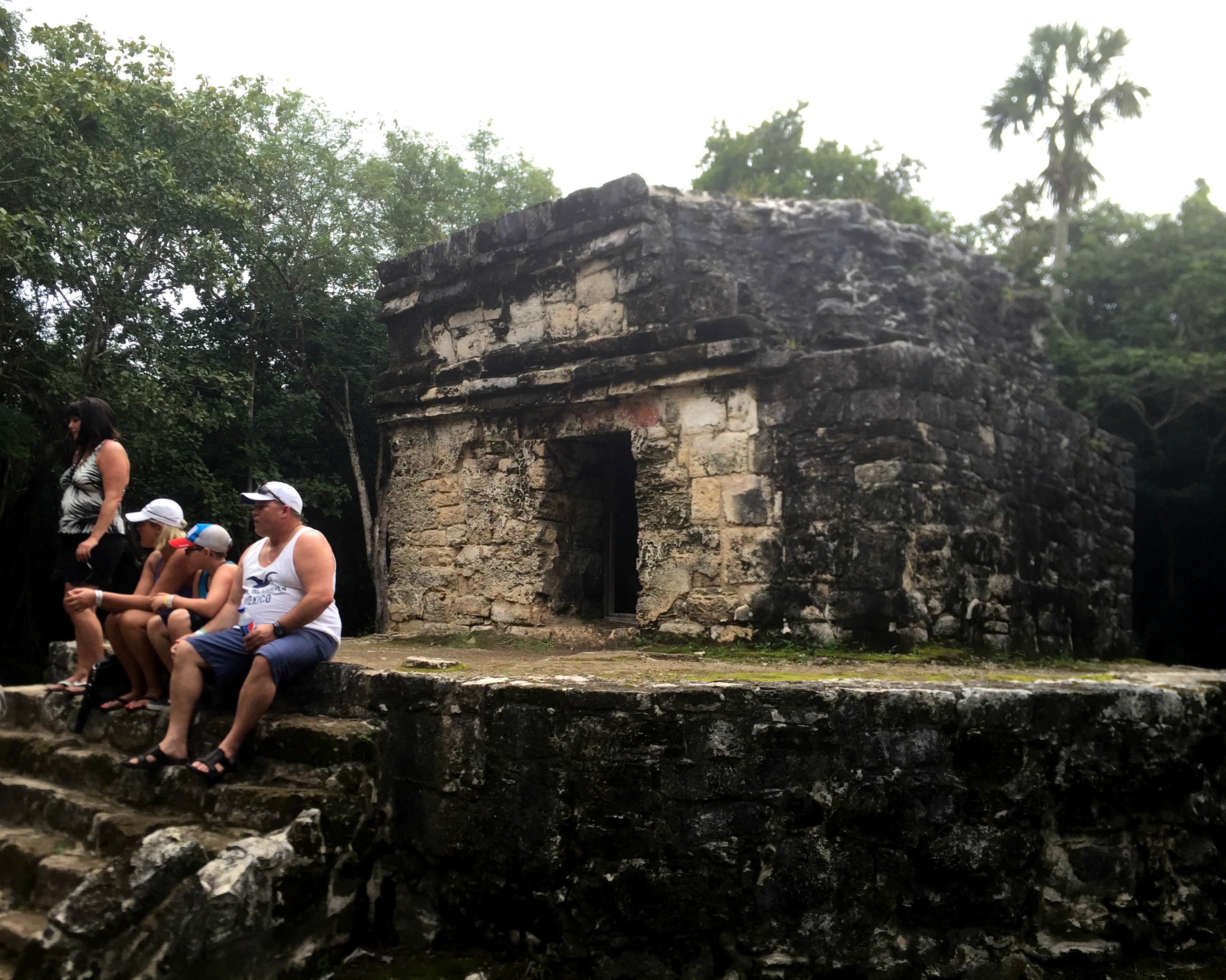 Today we took a day trip to find the Mayan ruins where they worshiped the goddess Ix Chel.  It did feel like holy land walking through the forest.  Or as Sue Ann likes to say, the jungles.  I like to pretend I’m not in the jungles.  The tourists came in all shapes & sizes. There was a family from Alberta Canada, climbing the structures from 1200 AD.  They were too fat to get up over the mossy stones (& I was mildly appalled at their irreverence).  There were Latin hipsters taking selfies in front of the temples.  And me & Sue Ann, two little gays from LA running out of clean clothes, dressed up in Thai elephant pants and flannel.  As we left the temple grounds, I blessed us, just in case Ix Chel has since retired.  It may be a tad late for me & conventional fertility, but I’ll take a blessing or two for more songs & stories. Sue Ann on the other hand, may fare well with the traditional magic.  As we put-put our way back to home base, the darts of rain pinch my face & soak our anti-wardrobe, one layer & one kilometer at a time.